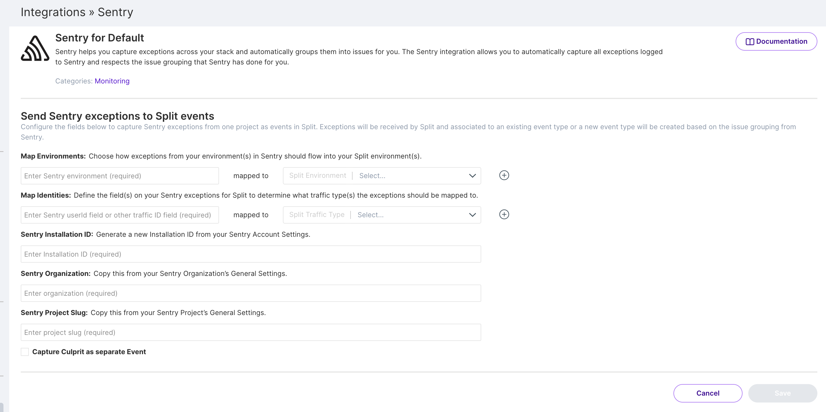 Capture Culprit as separate Event. If you have have specific Sentry Issues that come up consistently and want to be able to create metrics based on a specifc Sentry Issue - select this checkbox to capture an extra event for each exception sent from Sentry.